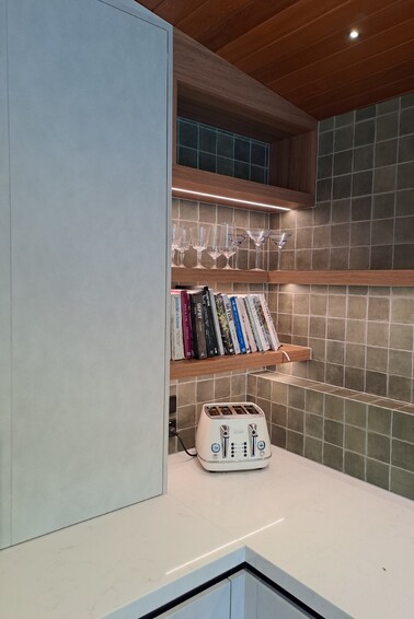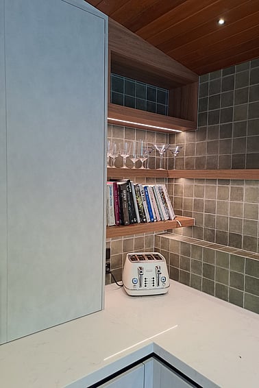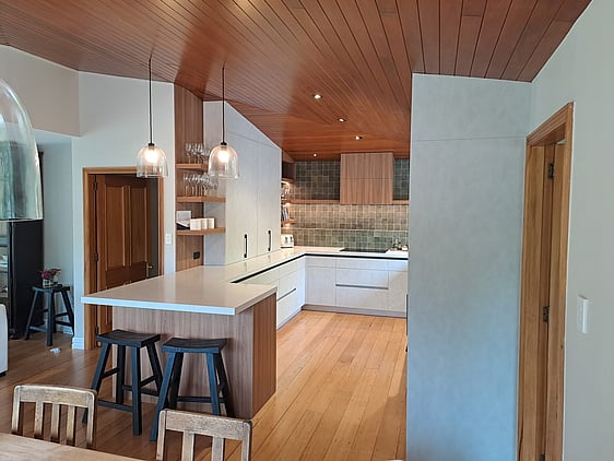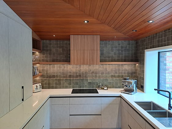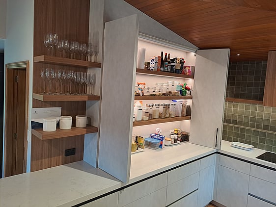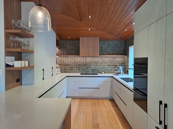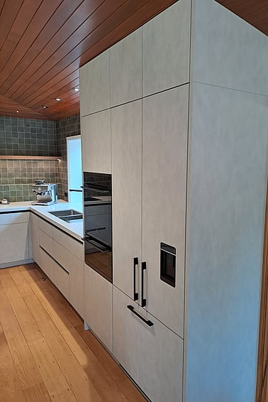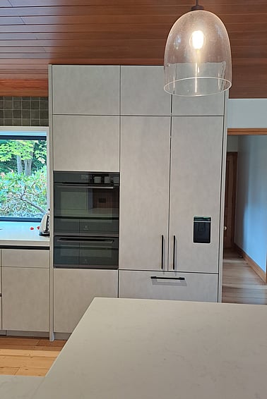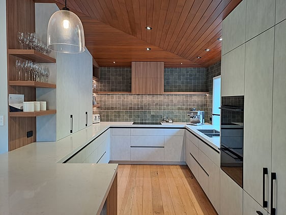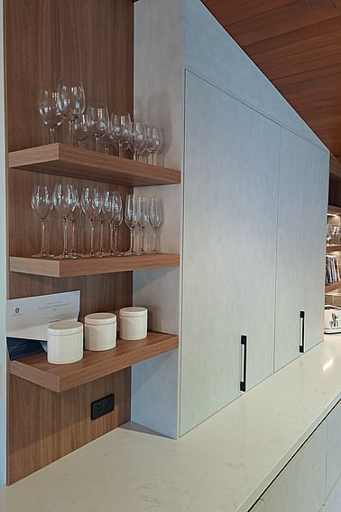 Melamine Cabinetry with Timberland and Honed finish, Engineered Stone tops, featuring integrated appliances.